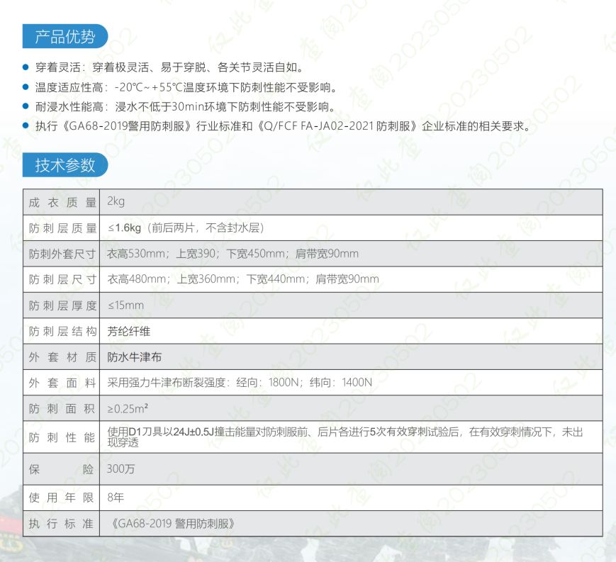 防刺服是用于執(zhí)行防暴任務(wù)時(shí)對(duì)身體進(jìn)行防護(hù),能夠抵御利器、銳器及刀具的襲擊。防刺服由外套、防刺內(nèi)膽兩部分組成,采用魔術(shù)貼連接,可依據(jù)穿著者身材的大小靈活調(diào)節(jié),防刺性能優(yōu)良,重量輕、厚度薄,能減少人體負(fù)重。利用現(xiàn)代特種金屬材料制作,同時(shí)兼具柔性特征的防刺。廣泛應(yīng)用于公安干警、特警、巡警及安保維穩(wěn)、武警部隊(duì)等正常執(zhí)行任務(wù),一旦出現(xiàn)緊急情況,可隨時(shí)用于保障人員身體、生命安全。