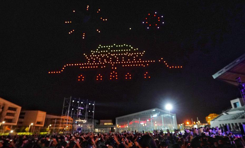9月17日晚,一場無人機燈光秀表演在南京航空航天大學天目湖校區(qū)“筑夢云天”迎新晚會上亮相,300架無人機伴隨著燈光和音樂緩緩升空,組成愛我中華、天安門、大飛機等圖案,迎接國慶節(jié)的到來。